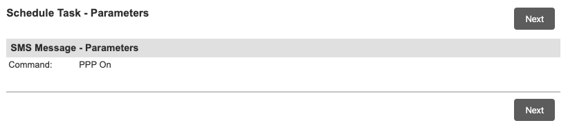 - The SMS Message - Parameters page opens. Click Next and the ppp on command is sent immediately by SMS message. It may take a few minutes before the Local Manager receives the SMS message and activates PPP to phone home.