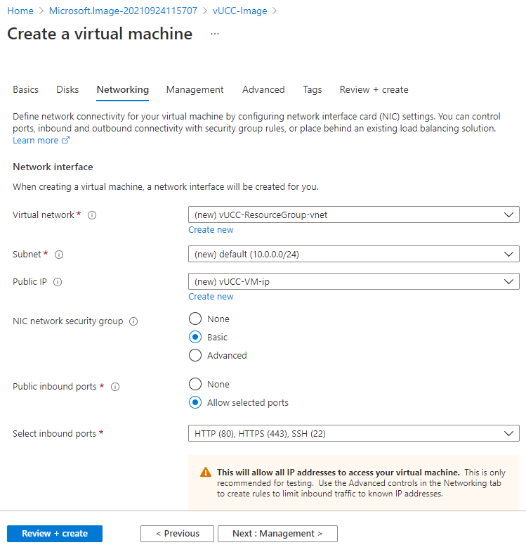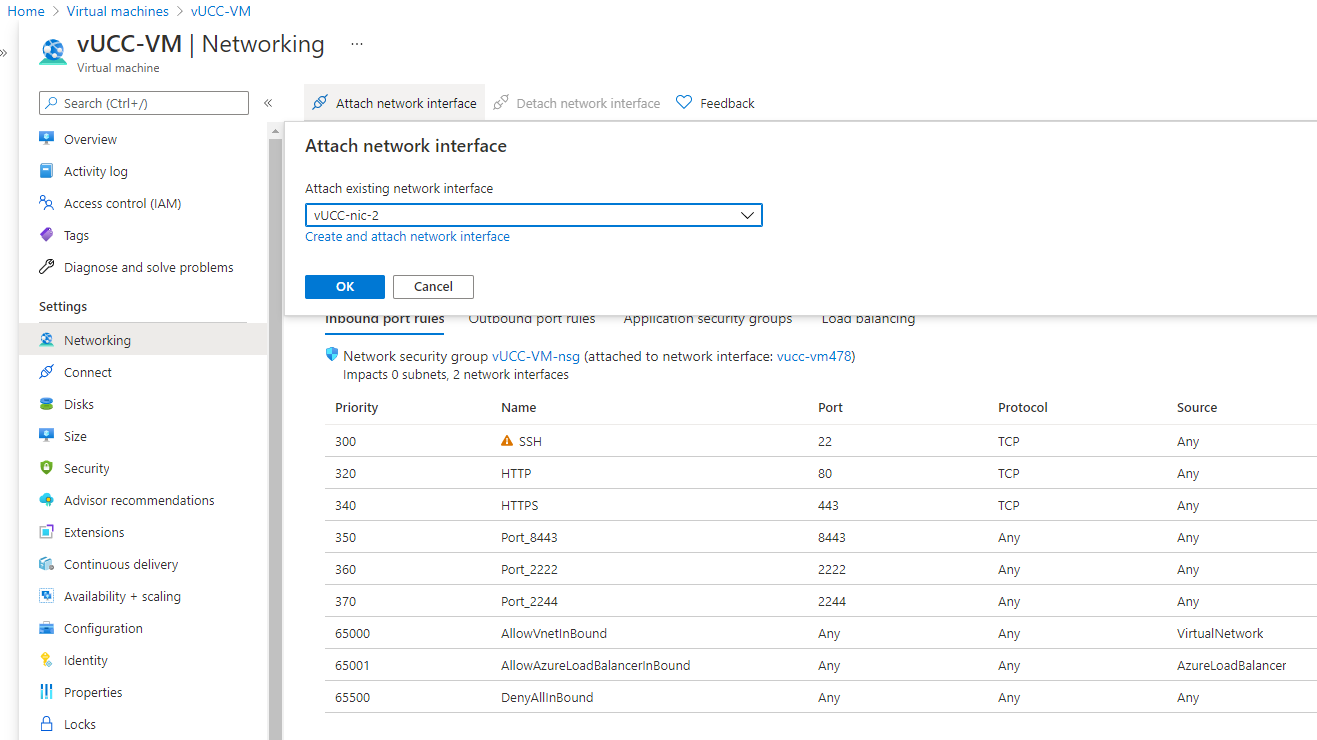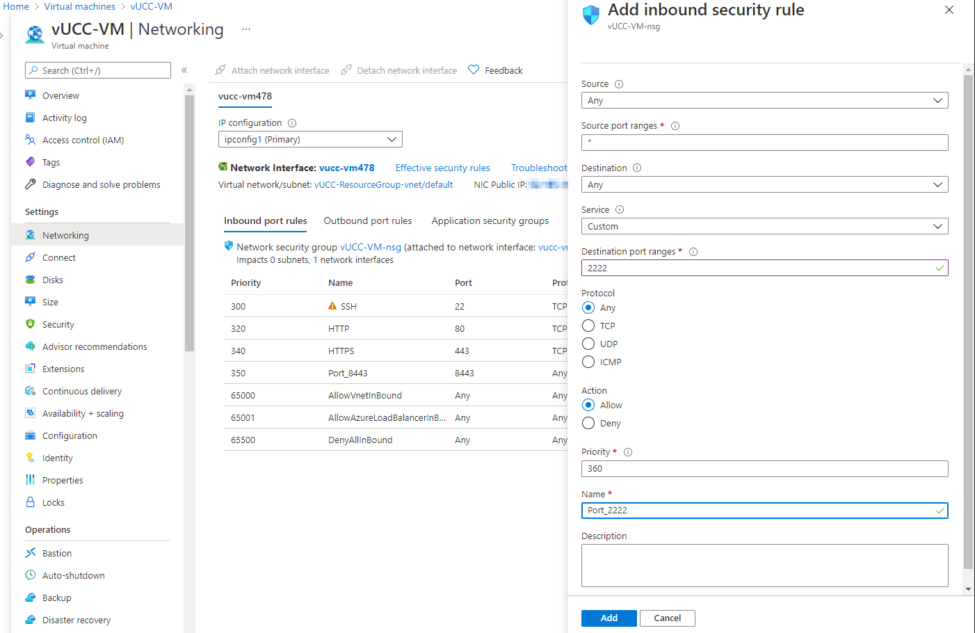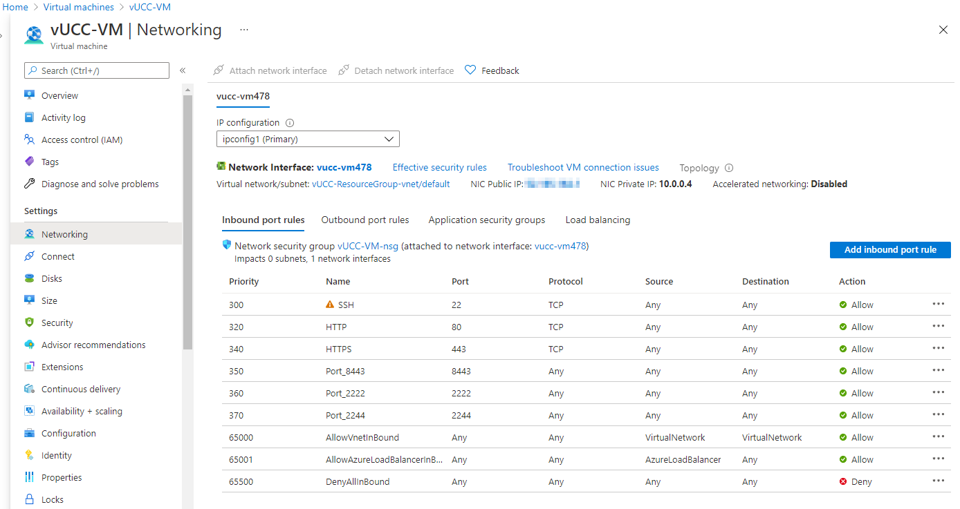 The CC uses the following ports: 22, 80 (optional), 443, 8443, 2222, 2244. If you navigate to Networking, the default page should list your primary network interface and inbound port rules. Click Add inbound port rule to allow inbound traffic to each port.