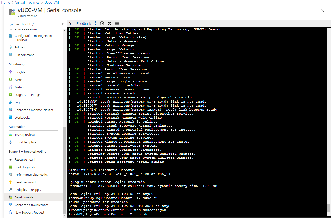 The database and web application do not start by default to avoid possible corruption that could occur while troubleshooting any deployment issues. Log in over either the serial console or SSH as emsadmin and password. Then run sudo su - to become root. Run ucc chkconfigon and reboot. On the next restart, all services will start automatically.
