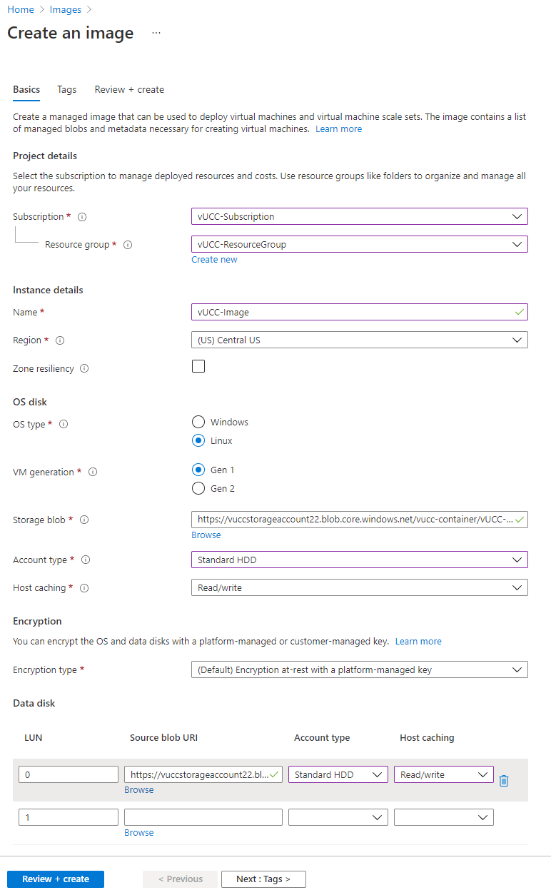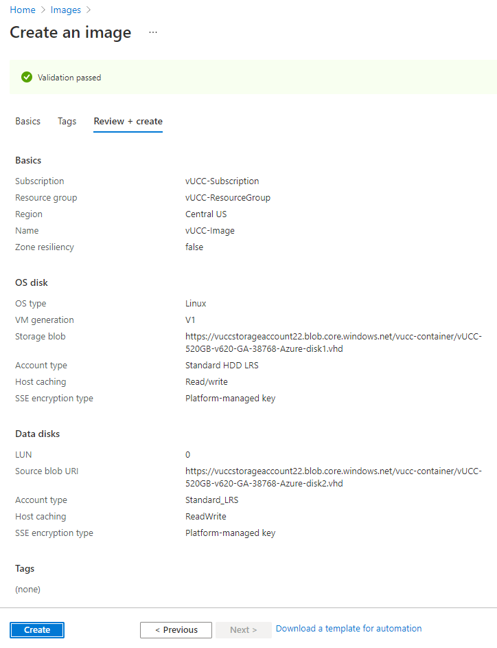 Create an image from disk1. We recommend using the same Region that was selected for the Resource Group and the desired VM.