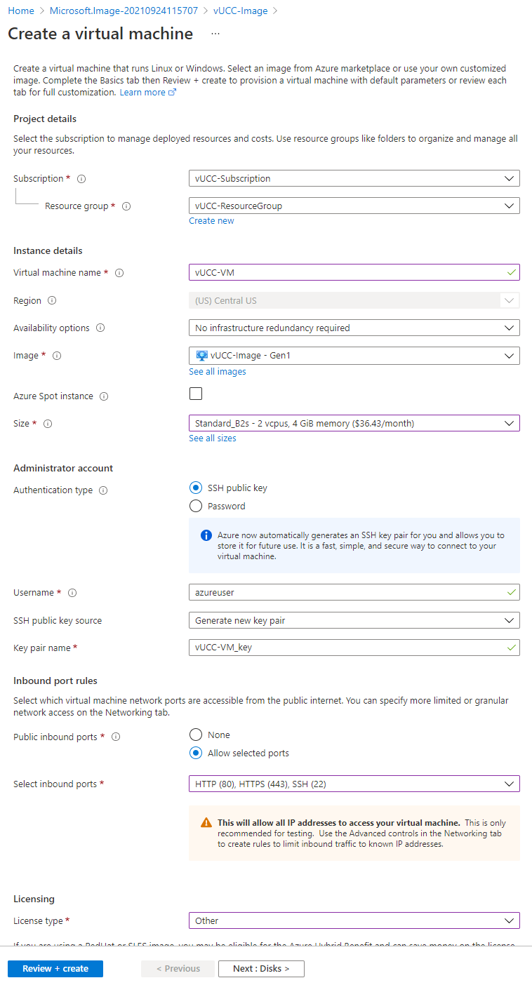 Navigate to your new image and click Create VM. For Size, the default configuration requires 2 CPUs and 4GB of memory. We recommend selecting "Standard_B2s". You can leave the Administrator account settings defaulted to SSH public key. The key pairs are not required for deployment. For inbound ports, allow HTTP (80), HTTPS (443), and SSH (22). License type can be Other. Click on "Next : Disks".