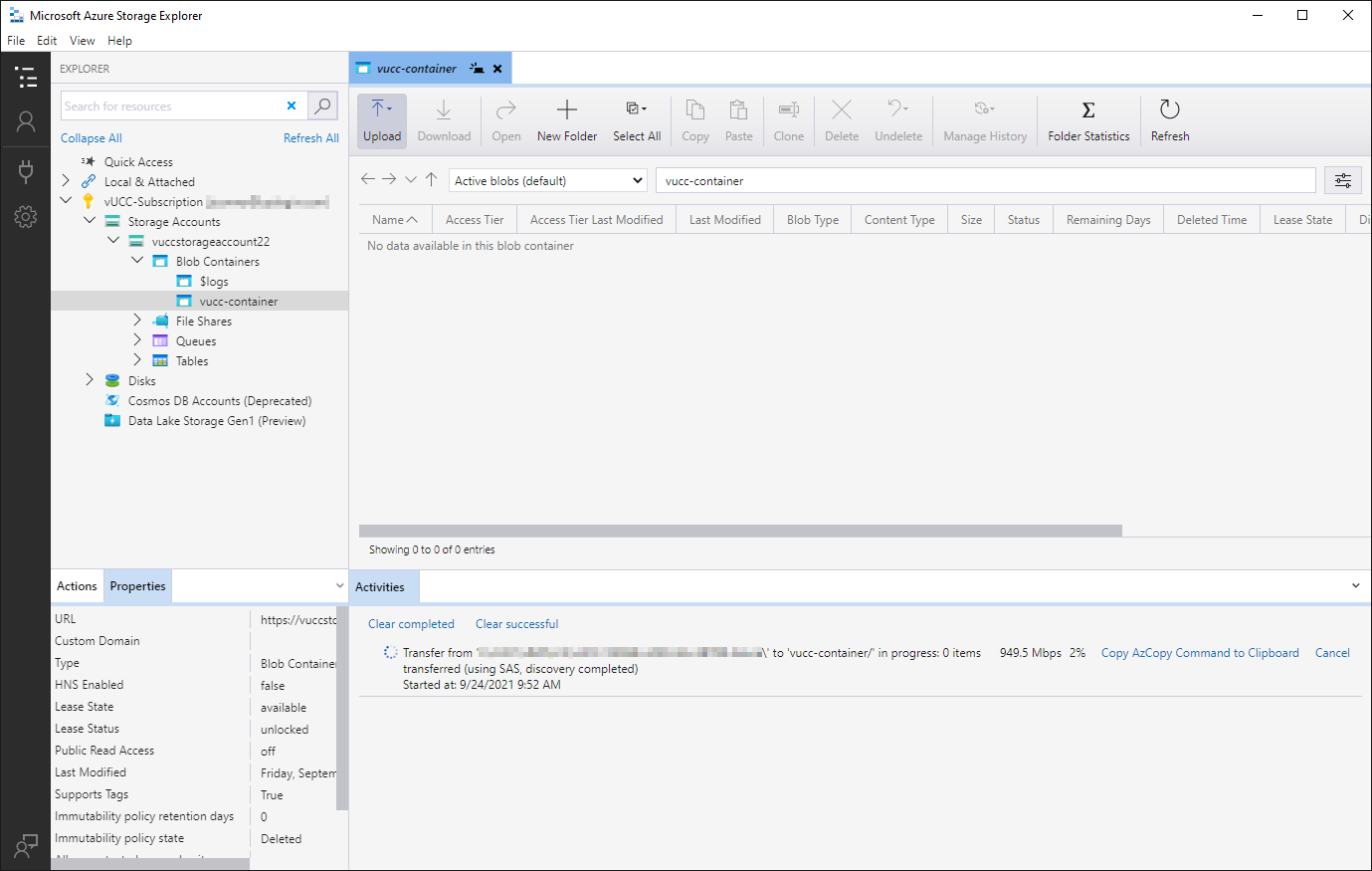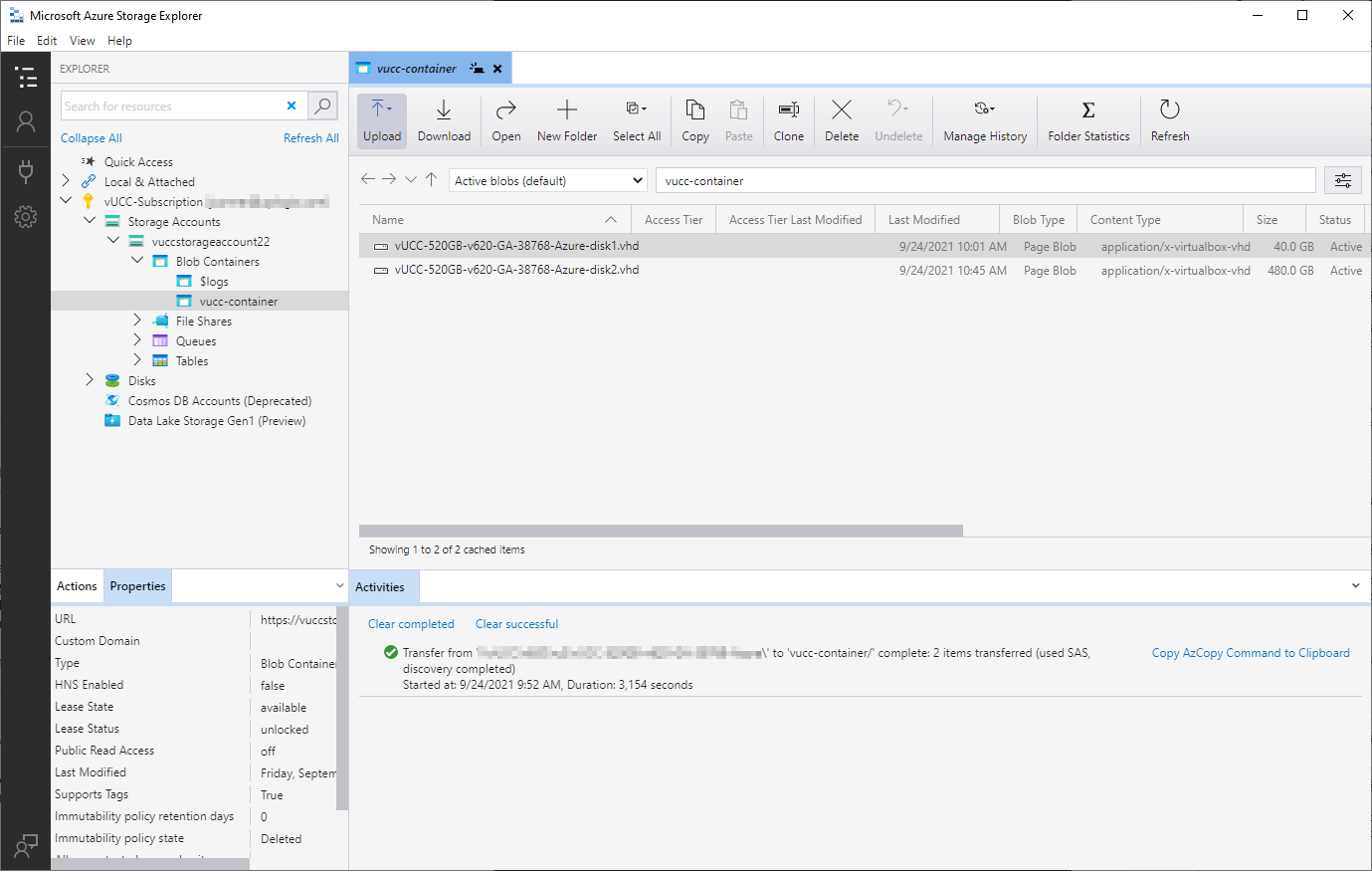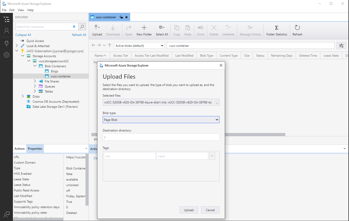 You can use the web page at portal.azure.com to upload the files into the Container, but we recommend using the Microsoft Azure Storage Explorer or PowerShell. The web page usually works for uploading disk1 (40GB) but is both slow and frequently can time out when uploading disk2 (480GB). The Storage Explorer application transfers data faster and handles timeouts well.
