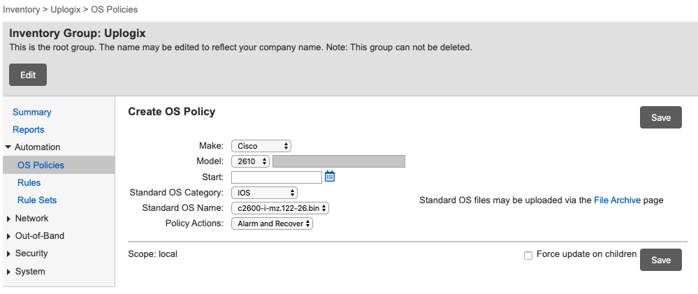 In most cases, the operating system policy will result in alarm when managed device's operating system does not match the standard. In the case of Cisco equipment running IOS or IOS-XE software, the Lantronix can be configured to automatically recover the managed device to the defined operating system standard.