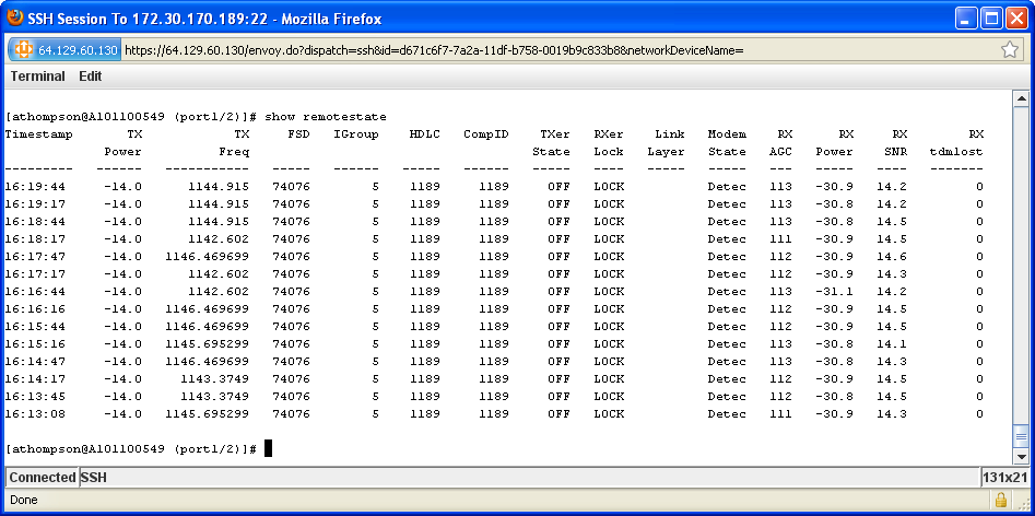 - Remotestate - Checks the status of the iDirect with regard to receive and transmit power, frequency and errors, FSD, IGroup, HDLC, CompID, receive lock, link layer, modem state, receive AGC, receive signal-to-noise ratio and receive tmdlost.