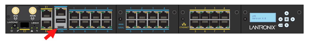 The USB console port on the LM83X is a USB-C port located in the Console stack to the left of the fixed serial ports.