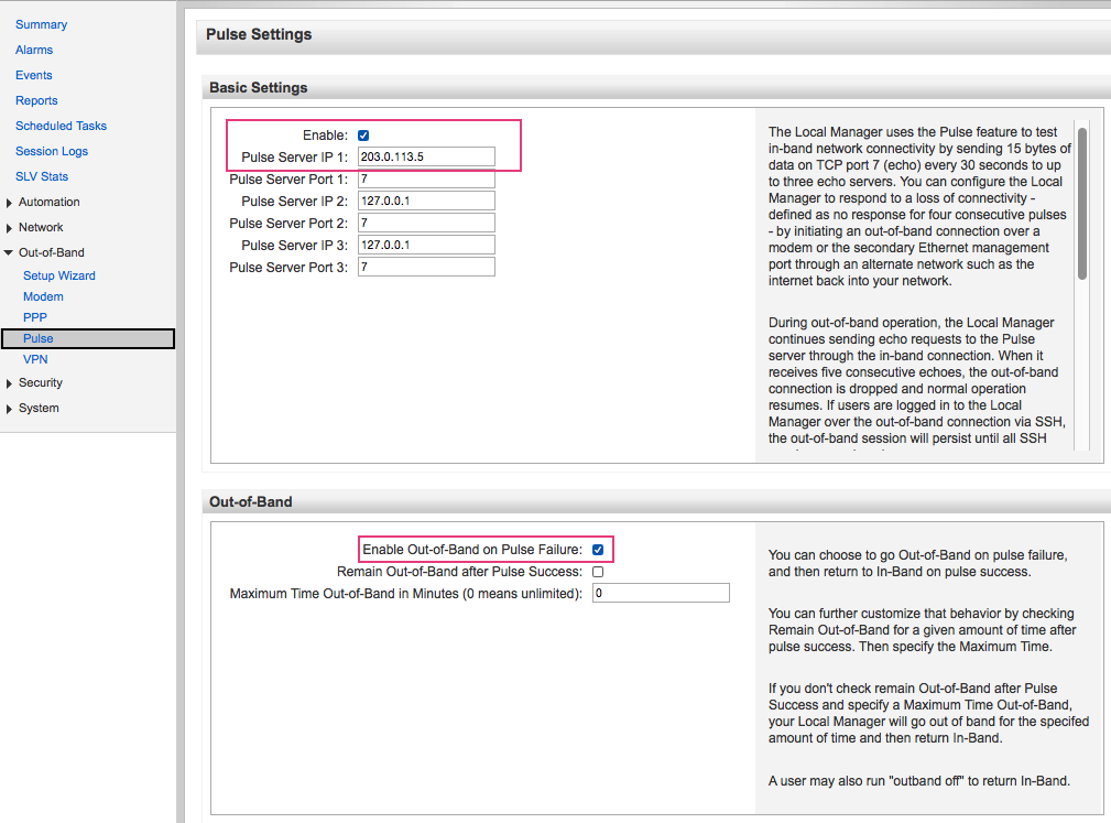 If the pulse settings are not yet configured, click on the Out-of-Band->Pulse link in the configuration menu on the left side of the Local Manager page to configure pulse settings. Be sure to enable pulse, point it to at least one pulse server and to "Enable Out-of-Band on Pulse Failure." Be sure to click the Save button to commit the configuration change.