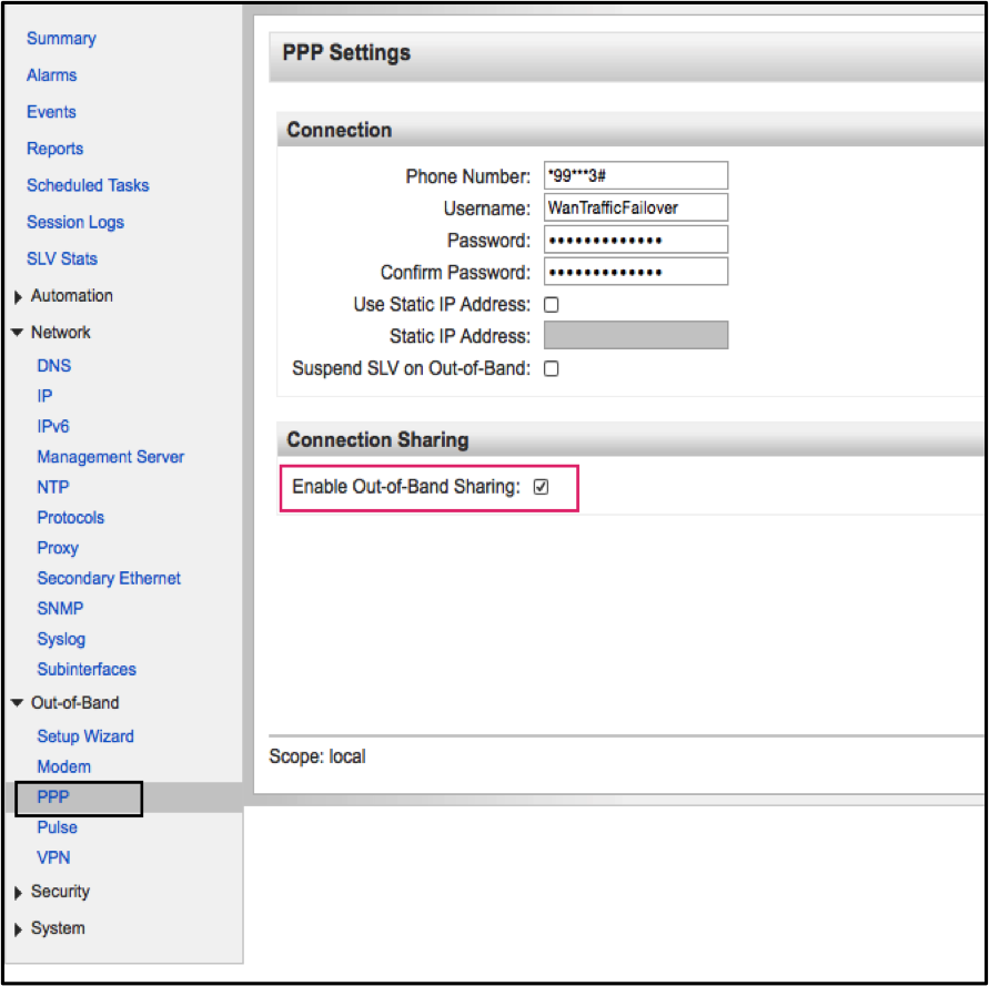 PPP should already be configured since we assumed an installed and working cellular modem. Therefore, the only PPP configuration that must be made for WTF is to check the box for "Enable Out-of-Band Sharing".