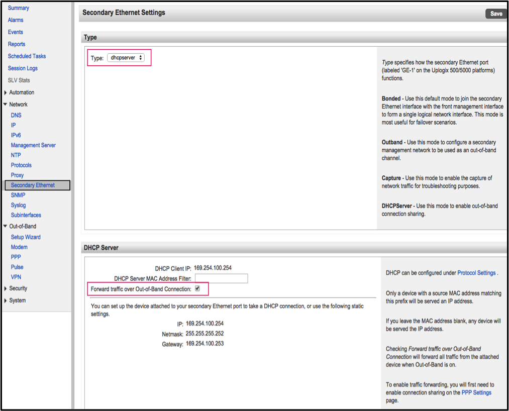 - Set the secondary Ethernet Type to dhcpserver