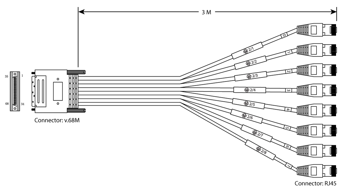 The 16 Port Serial Card is used with 8-connector fan-out cables that have a v.68M connector for attaching to the card and 8 RJ45 connectors pinned as DCE. Two of these cables can be used to connect the card to up to 16 devices.